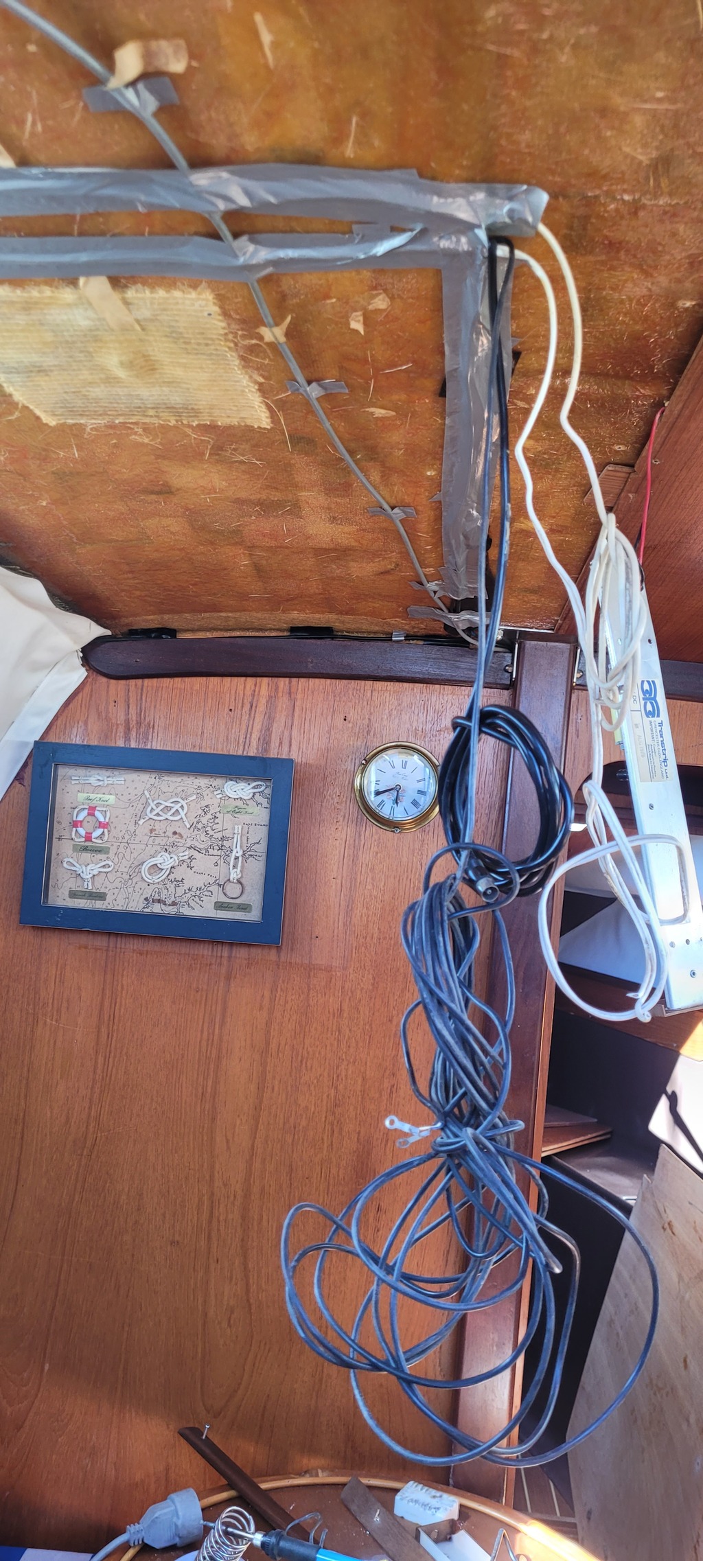 Demain, j'esépre arriver à "tirer" le cable de la sonde de son emplacement actuel, identifier le nouveau passage du cable, démonter le doublage bois du plafond, passer le pont, et reassembler tout.