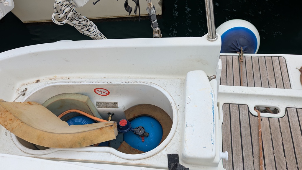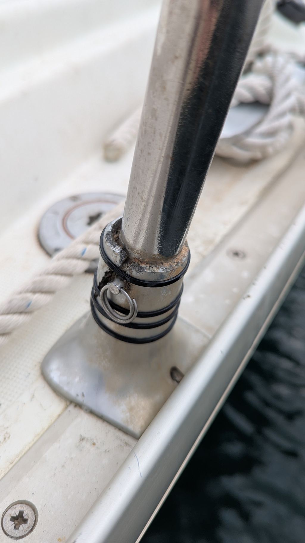Probleme : pour arriver à le sortir et en enfiler un nouveau, il faudrait pouvoir déposer tout le balcon arriere tribord qui est fixé en 3 points. Les 2 autres points de fixation n'ont pas de pied, le balcon est fixé directement (voir photo). Et un de ces points de fixation est innaccessible car il se trouve derriere le rangement des bouteilles de gaz qui a l'air d'un ensemble moulé qu'on ne peut pas ouvrir.