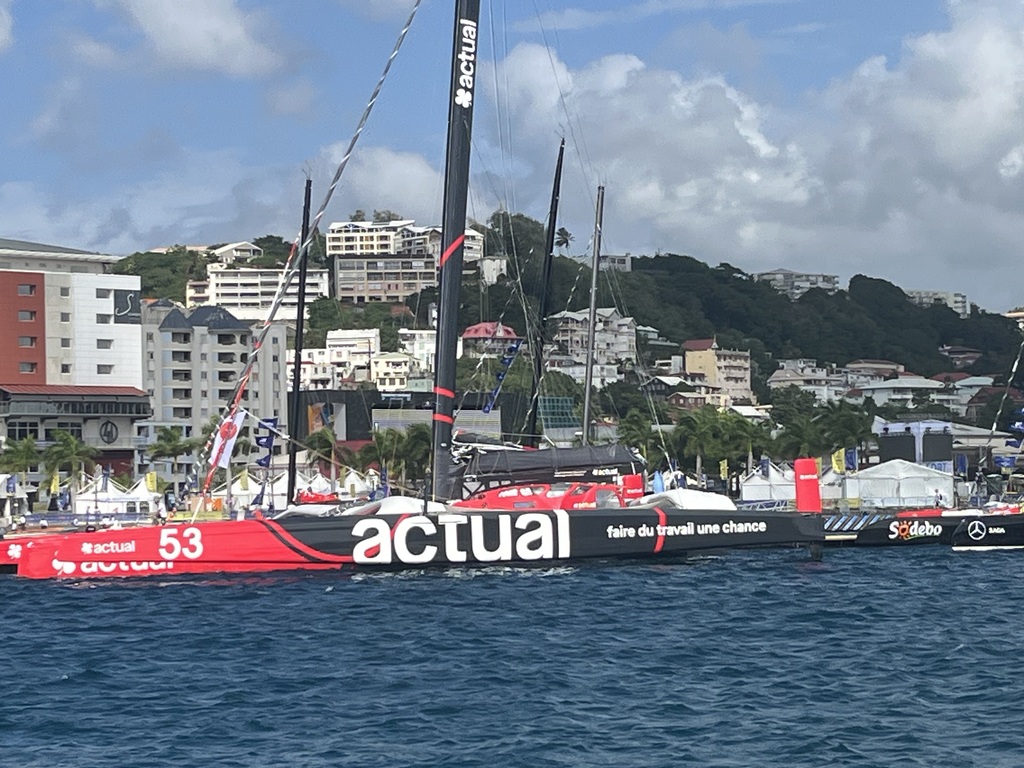 Le premier IMOCA, Charal, en approche, il vire le rocher du Diamant.