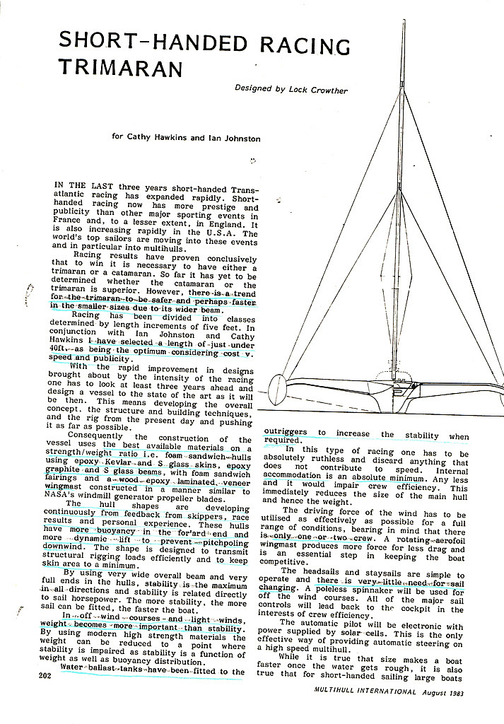 Je viens de finir "Return into the Wake", le livre de Cathy Hawkins et je trouve que ce trimaran est l'un des plus intéressants jamais construits. Architecte : Lock Crowther