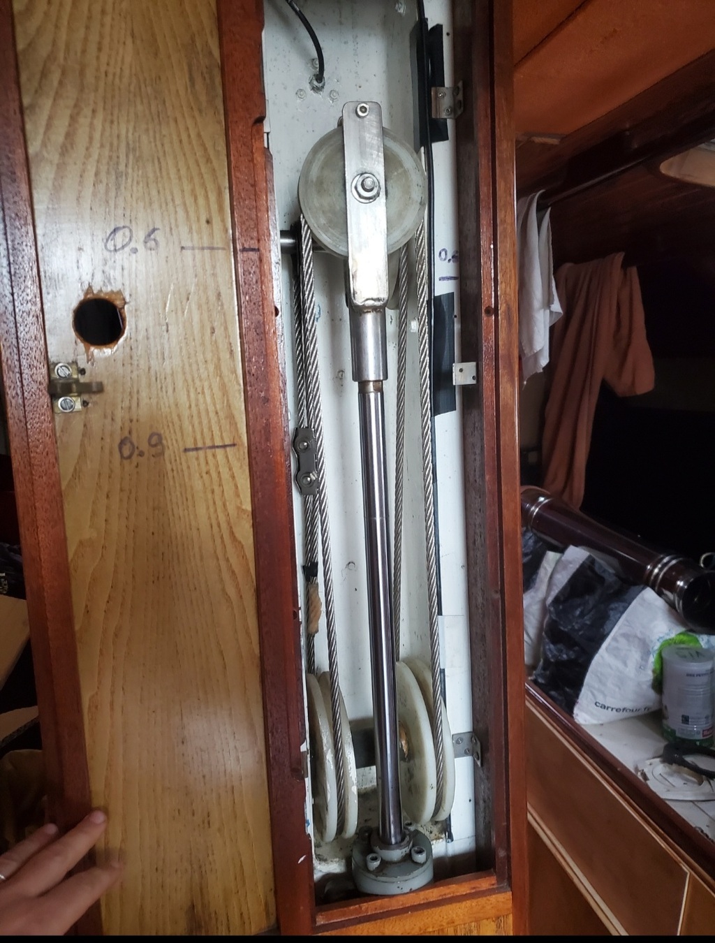 De plus le verin installé ne nous permet de descendre la dérive que de 90 cm alors qu' elle doit descendre de 50cm de plus originellement avec le système de bouts et poulies. On ne sait pas si sur ce type de bateau (plus de 10 tonnes) ça aurait une réelle incidence au près mais ça nous paraît un peu dommage...