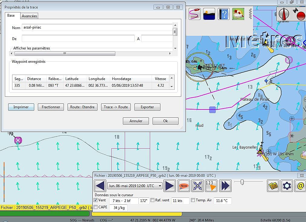 mais le relevé météo de port Mahe donnait des valeurs sensiblement équivalente au fichier météo et a mon anémomètre sachant que le fichier grib indiquait un vent au 172° et le relevé de Port Mahe donnait un vent au 180° avec un prevision de courant de 1 knt au 42°