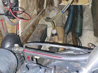 Cette durite fait une grande boucle (Flêches rouges) et, à mi-chemin, ce piquage avec retour (Flêche bleu) sur le Water-Lock. (voir photo)