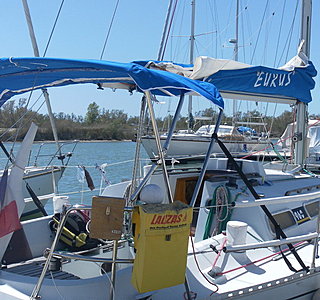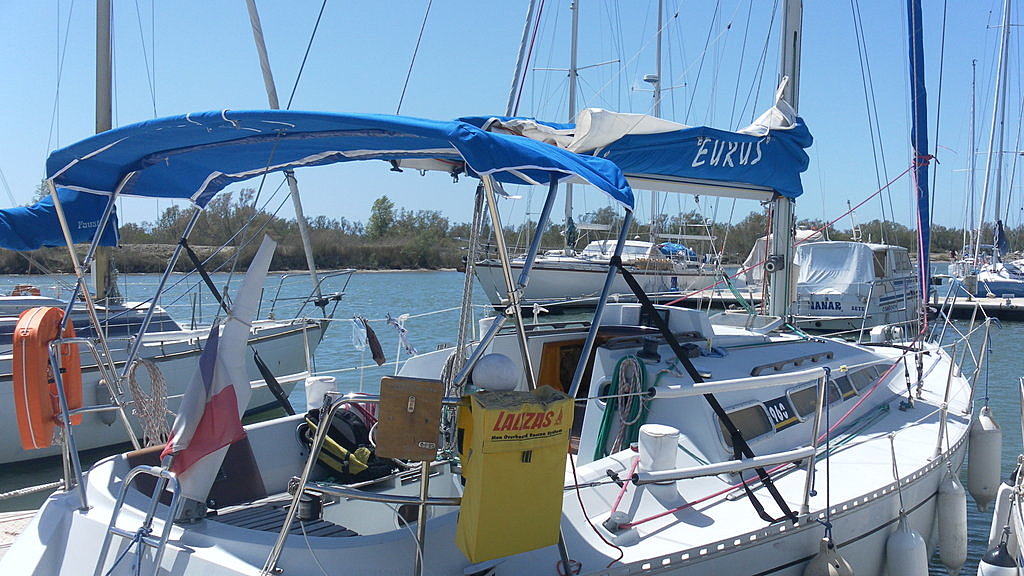 avec un grand bimini couleur blanc et panneaux solaire extra plat sur rouf ( acheter chez LR SOLAIRE pour ne pas faire de pub)