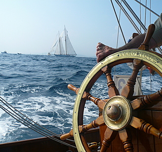 Avec le petit temps qui sévit habituellement en fin de matinée dans la baie de St Tropez, tous les voiliers classiques « tournent » tranquillement en attendant que le vent s’établisse. L’hôtesse, Julie, fait circuler des boissons… Admirer de près tous ces voiliers est spectacle rare.