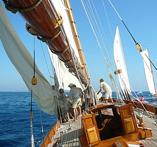 Peu après, nous « touchons » le vent qui refuse. Une dizaine de nœuds de sud-est, canalisé par la baie. «VERONIQUE» gite et accélère à plus de 8 noeuds. Dès que j’estime être suffisamment « rentré dans le refus », nous virons. Sur ce yawl resté « dans son jus », il n’existe aucun winch, la grand voile, l’artimon, le foc, le clin foc comme la trinquette sont bordés à l’aide de palans.