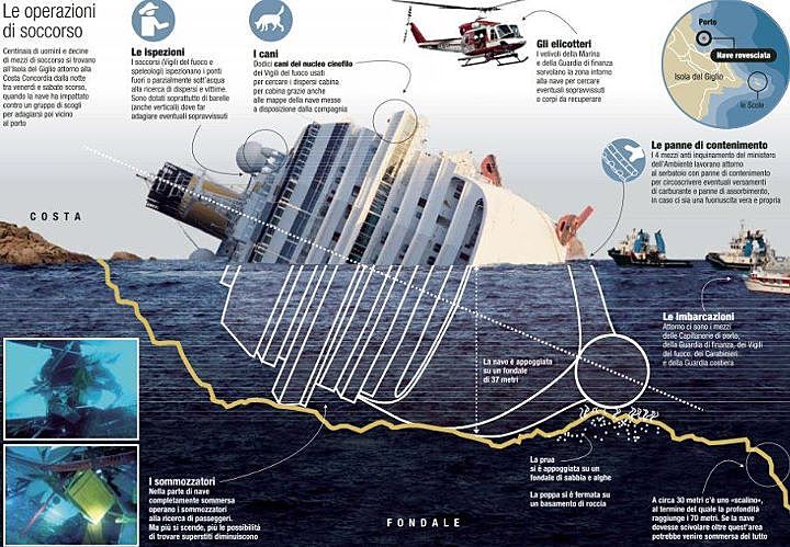 pour le moment il paraît que ce soit un échouement, oui volontaire; il y a une brèche de quelques dizaines de mètres sur la coque, il sembrle que le capitaine ait ordonné d'aller s'échouer en face du Giglio pour ne pas couler et pouvoir évacuer plus facilement les passagers