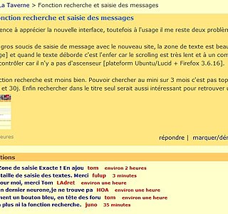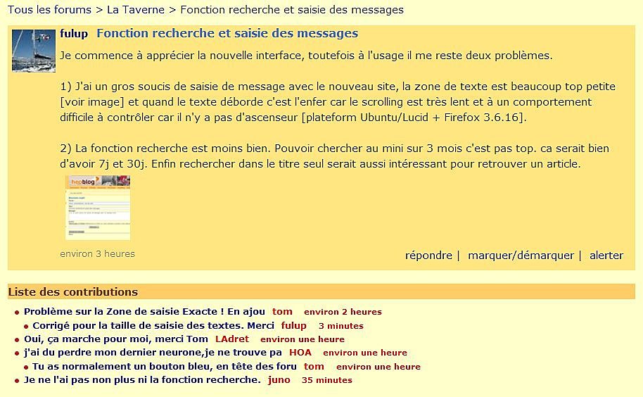 1) J'ai un gros soucis de saisie de message avec le nouveau site, la zone de texte est beaucoup top petite [voir image] et quand le texte déborde c'est l'enfer car le scrolling est très lent et à un comportement difficile à contrôler car il n'y a pas d'ascenseur [plateform Ubuntu/Lucid + Firefox 3.6.16].