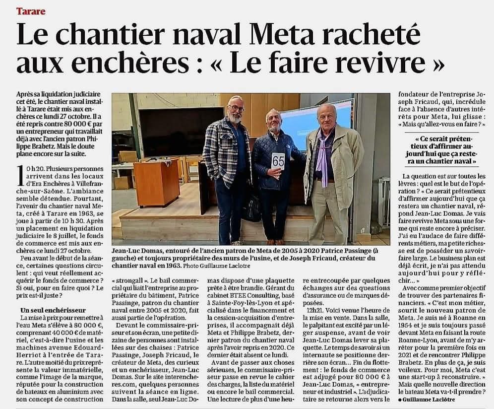 Placé en liquidation judiciaire le 8 juillet dernier, le constructeur de bateaux métalliques basé à Tarare a été vendu aux enchères ce 27 octobre. Une seule et unique offre, lancée à hauteur de la mise à prix, a suffi à l'adjudication de la société créée en 1963 par Joseph Fricaud.