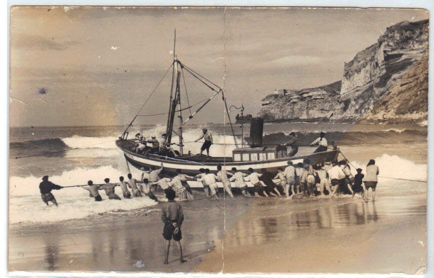 Et sans rapport avec la pêche à la morue, la mise à l'eau d'un bateau de pêche à Nazaré, dépourvu d'un port à l'époque, il y a qq dizaines d'années.