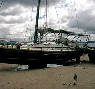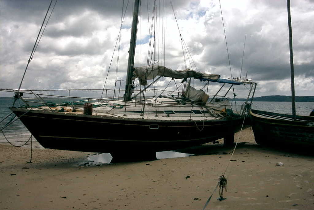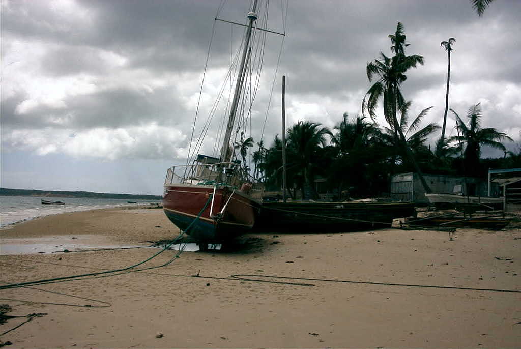 c'est un sun légend 41 quillard, laissé au mouillage à l'arrivé d'un cyclone, dans la baie de Diego Suarez, devant la plage d'un village de pêcheurs, puis abandonné sur la plage par son propriétaire, alors que le bateau n'était pas endommagé. ( deux premières photos).
