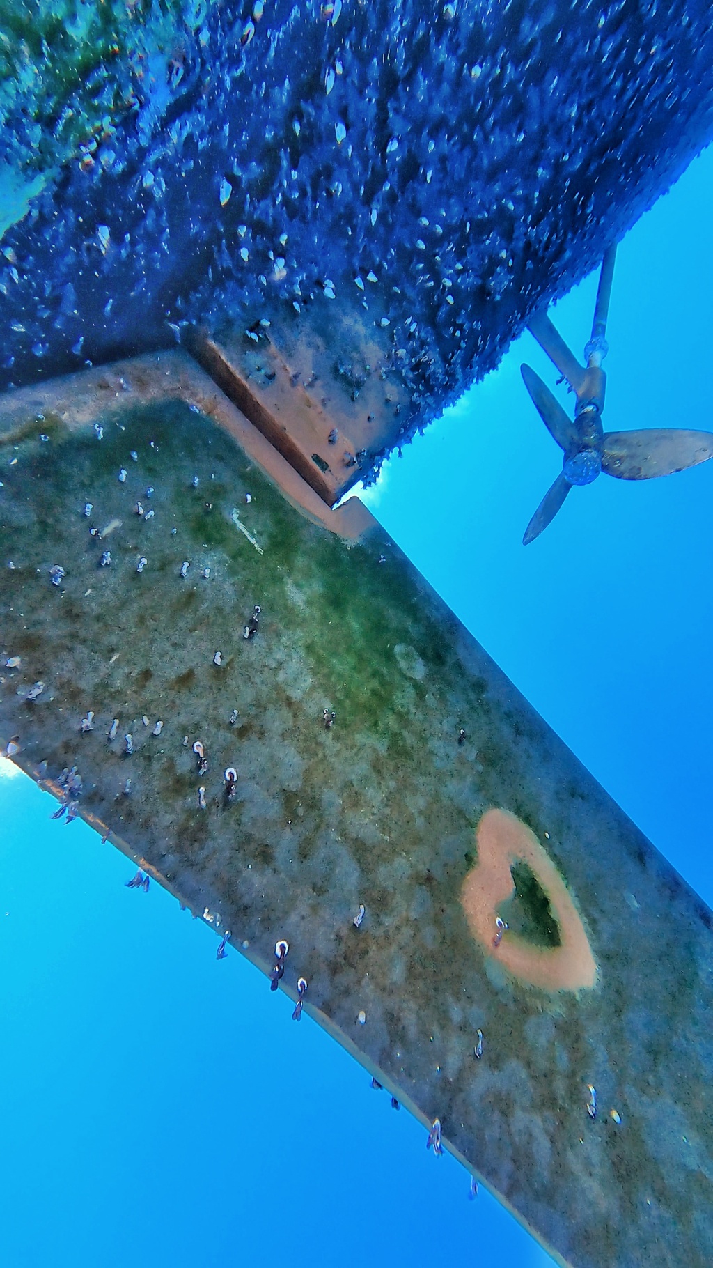 On a dû nettoyer la coque en plongée aux Galapagos car il y avait quelques concrétions ( carénage fait à Grenade)