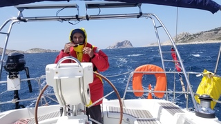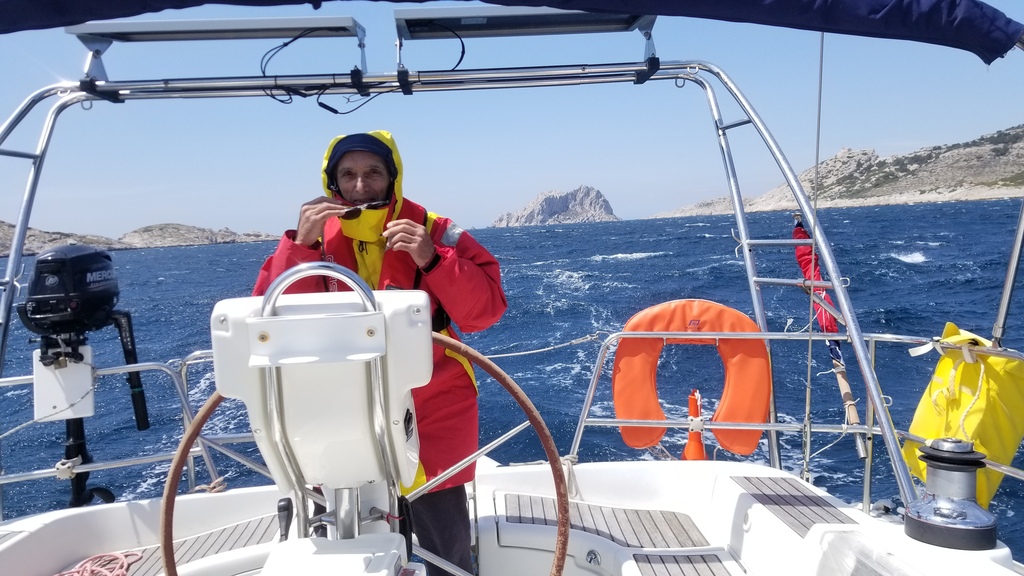 Nous partons de Port Saint Louis du Rhône avec un fort mistral au portant, la mer est peu formée mais ça souffle fort, des rafales à 8 ou 9. L’un de mes équipiers est un peu inquiet, mais le bateau marche à 8 noeuds et confortablement avec juste un petit foc. C’est quand même un peu rude pour une première journée. Nous nous arrêtons à La Ciotat pour nous reposer un peu.