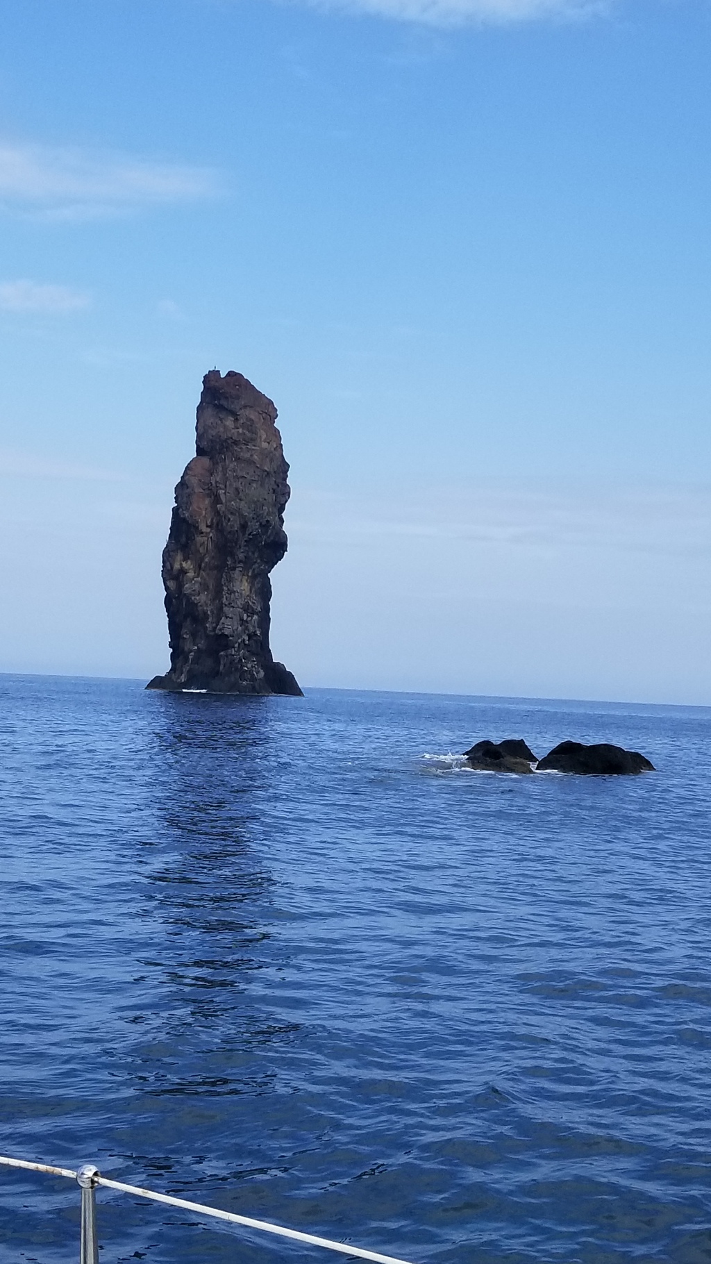 Heureusement, elle s’avère plus confortable que les précédentes et nous arrivons vers 3 heures du matin devant Alicudi, la prochaine île éolienne. Comme il n’y a pas de port dans cette île, je mets en panne et laisse le bateau dériver en veillant d’un œil, l’autre n’est pas très ouvert. La mer est calme, il y a des étoiles, la masse noire du volcan se devine tout près, c’est finalement un moment très agréable. Quand le jour se lève, on se rapproche de l’île et là, les bouées indiquées n’ont pas été installées, pas grave nous allons mouiller. Mais l’île est un vrai cône volcanique, il y a 35 mètres de fonds à 20 mètres du bord et nous ne trouvons pas où mouiller. Il y a bien des mouillages indiqués de l’autre côté de l’île, mais cela fait un vrai détour. Donc, on repart pour la 2ème fois. Heureusement, il n’y a que 10 milles à faire pour trouver un mouillage superbe à Filicudi, au pied d’une aiguille de rocher volcanique. Le pastis y a un goût particulier et il est très apprécié.