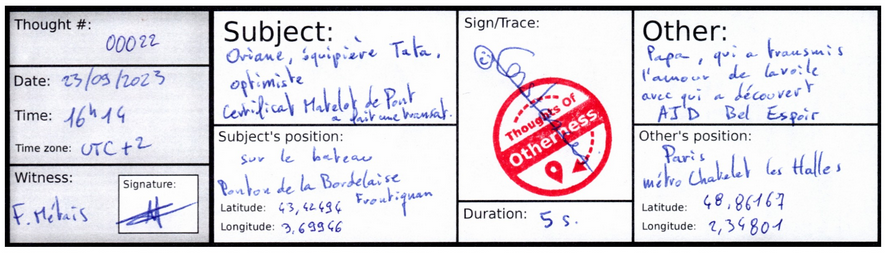 • C’est d’abord un projet artistique, relevant de l’art contemporain, art relationnel, participatif, cumulatif. Il s’agit d’un registre de pensées orientées vers l’autre. Concrètement, lors de notre itinérance vélique, je demande à des gens que je rencontre de « penser à quelqu’un ». Ensuite, je remplis un rapide formulaire dans lequel je précise le lieu, la date et l’heure de la pensée, le destinataire de la pensée, etc. L’œuvre consiste en un registre de pensées orientées vers l’autre. Le registre a une forme physique, papier, mais aussi une forme numérique : chaque pensée est convertie en un NFT (Non Fungible Token) enregistré dans une collection sur une blockchain. ()