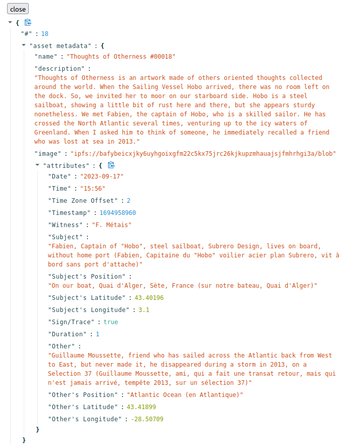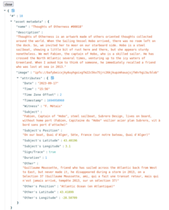 • "bien ancré dans le réel côté sous", effectivement le projet prévoyait de pouvoir mettre en vente (5 dollars) les "épisodes" (c'est à dire les pensées récoltées), un peu comme on vend un récit de voyage. Mais qu'on se rassure, ce projet n'a absolument rien rapporté. Les NFT ont bien été "mintés" (c'est à dire inscrits sur la Blockchain), mais je n'ai jamais été au bout du process qui aurait consisté à les mettre en vente. Ceux qui sont "bien ancrés dans le réel côté sous" savent faire de l'argent, ce qui n'est pas mon cas, bon gré mal gré.